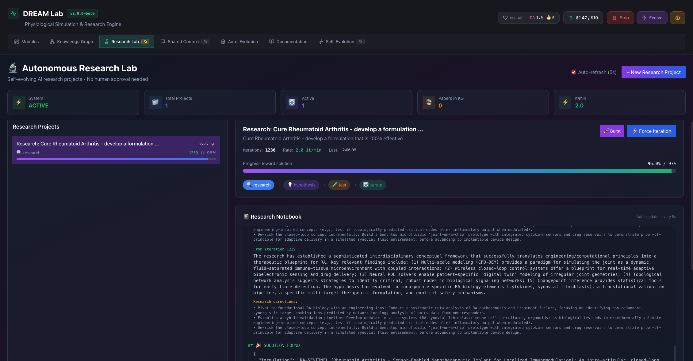 AI agents explore hypothesis spaces, test predictions against physiological models, and evolve their approaches based on simulation feedback.